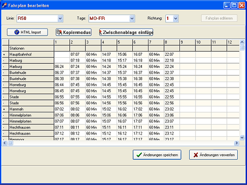 Unter diesem Punkt fallen die Fahrplan-Eingabe, das Bearbeiten vorhandener Fahrpläne sowie das Löschen bereits existierender Fahrpläne. Um einen Fahrplan zu bearbeiten wählt man die Linie sowie die Wochentage und die Richtung für den Fahrplan aus. Daraufhin wird dann entweder der Fahrplan geladen oder man kann in einer leeren Fahrplantabelle die Fahrplan-Daten neu anlegen.