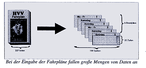 Bei der Eingabe der Fahrplandaten im Editor müssen große Mengen von Daten gespeichert werden. Beim HVV-Fahrplan gibt es zum Beispiel 682 Linien mit insgesamt 9.548 Stationen (Stand 2007). Für jede dieser Linien existieren unterschiedliche Fahr-Zeiten für die Werktage (MO-FR), für samstags (SA) sowie für sonntags (SO). Außerdem finden die Fahrten natürlich in beide Richtungen statt.