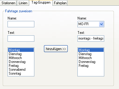 - Tag-Gruppen: Hier wird eingestellt, für welche Wochentage Fahrpläne erstellt werden können. Meistens wird dies für Wochentage (Montag-Freitag) sowie für Samstags und Sonntag sein. Gegebenenfalls kann hier auch gleich mit eingestellt werden, ob Feiertage und Sonntage in zusammen gehören (Sonn- und Feiertage).