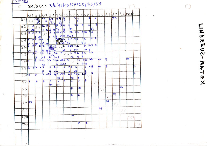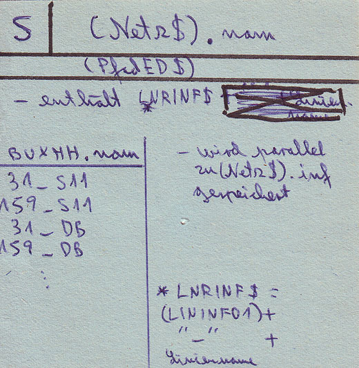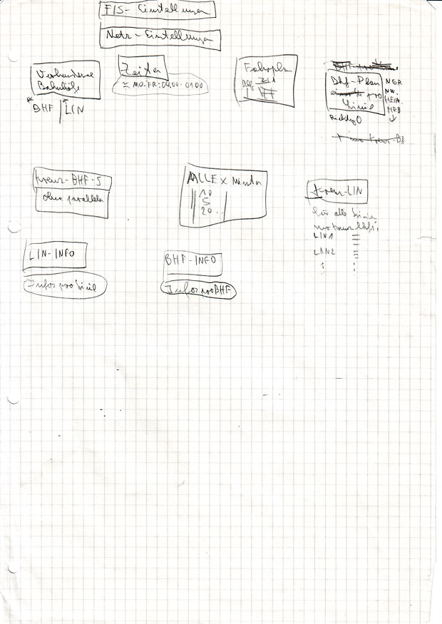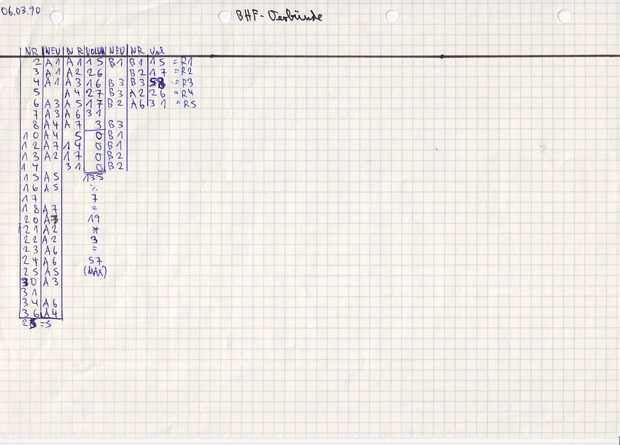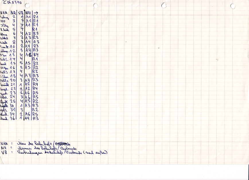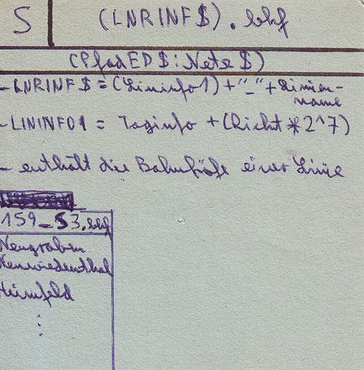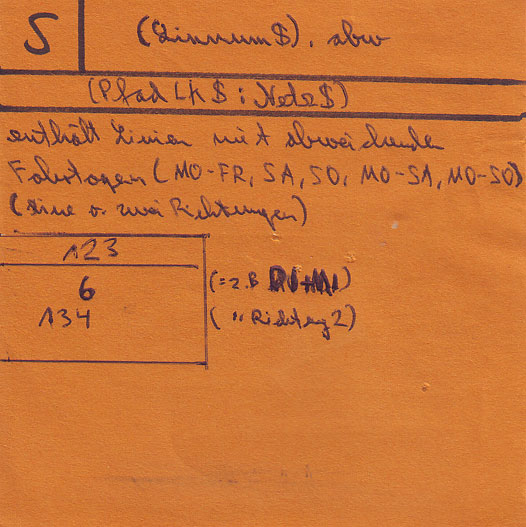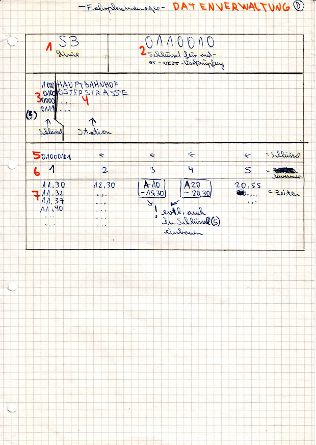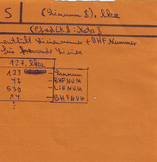 Nachfolgend finden sich die eingescannten Planungs-Unterlagen aus den Zeitraum von 1988 .- 1992 des Fahrplan-Programms. Es handelt sich allerdings teilweise eher um Notizen als um vollständige Plaunungsunterlagen. Ich programmiere vieles ohne vorher umfangreiche Planungen zu betreiben, da sich vieles erst während des Programmierens ergibt. Das kann man natürlich nur machen, wenn man alleine an einem Projekt arbeitet. Teilweise ist leider nicht mehr feststellbar zu welchen Datum einzelne Dokumente gehören. Ich habe versucht die Unterlagen nach der zeitlichen Reihenfolge zu ordnen.