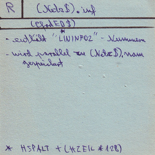 Diese Seite bezieht sich offensichtlich auf die beiden folgenden Seiten. Dort wird die Komprimierung der Fahrpläne anhand eines Beispiels dokumentiert. Die Notizen zur 'Lin-Zeit-Datei' beziehen sich wohl auf den Aufbau dieser komprimierten Fahrpläne.