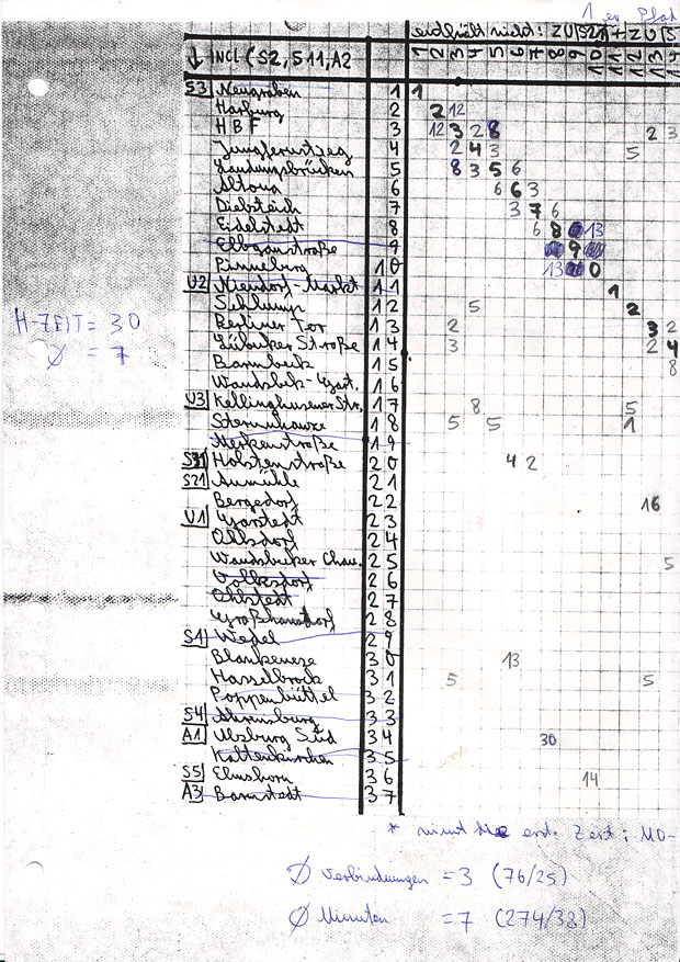 In dieser Tabelle befindent sich für die Stationen mit Umsteigemöglichkeit (Station bedient mindestens 2 Linien) die nächst-erreichbaren Stationen die ebenfalls eine Umsteigemöglichkeit bieten. Dabei werden parallel laufende Linien nicht berücksichtigt. Eingetragen wird die minimale Fahrzeit zwischen diesen Stationen. Rechts steht die Anzahl der Verbindungen je Station. Die Werte der Diagonalen dienen nur der besseren Übersicht. Die durchgestrichenen Stationen in der linken Spalte sind keine Stationen mit Umsteigemöglichkeit und werden daher nicht berückisichtigt.