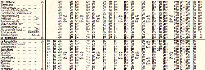 Im oberen Teil ist der Fahrplanausschnitt mit abgebildet. Dabei wurden die Stationen mit mehreren Linien-Anbindungen aufgeführt (Billstedt, Kirchstraße...) und die sonstigen Stationen in Blöcken zusammengefasst (Z1 bis Z6).